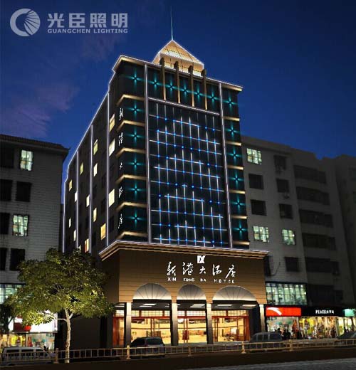 由于薛總并不是專業做外墻亮化施工,接觸這類項目并不多,所以新港大酒店外墻亮化全權交由光臣照明負責,從方案設計到燈具選型、整個項目的預算規劃,光臣照明都能熟練的處理。