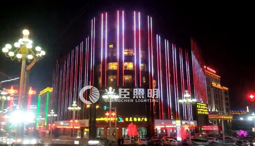本次亮化同樣采用的是LED全彩八段外控LED線條燈,商場外立面的縱向突出位置都安裝,整體出全彩屏效果。LED線條燈外殼顏色是深咖啡色,與外墻顏色一致,在白天能更好地隱藏起來。