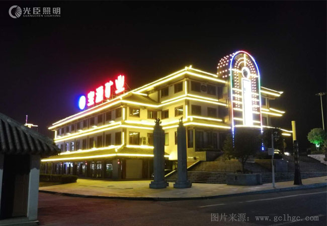 寶源礦業集團是行業中的標桿企業,對于宏偉的頭門來說怎能少得了亮化修飾,此次工程選用外控七彩線條燈、120MM七彩漸變LED點光源、以及金黃光的2819線條燈、4048洗墻燈組合完成。