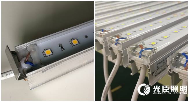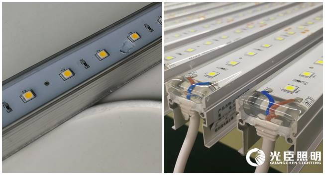 左為客戶樣品:灌膠太少,燈珠裸露 右為光臣產品:灌膠飽滿,完全覆蓋表面元器件,甚至與鋁材持平