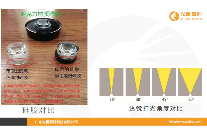 LED洗墻燈廠家光臣智科曾經做了一個關于光學透鏡材質與防水膠粘合程度的測試,得出結論:選劣質的LED光學透鏡,容易造成防水膠與透鏡之間出現不粘合現象。選用PMMA(亞克力)材料的LED光學透鏡不僅是發光效果好,防水膠與其粘合程度高。