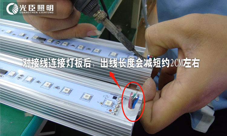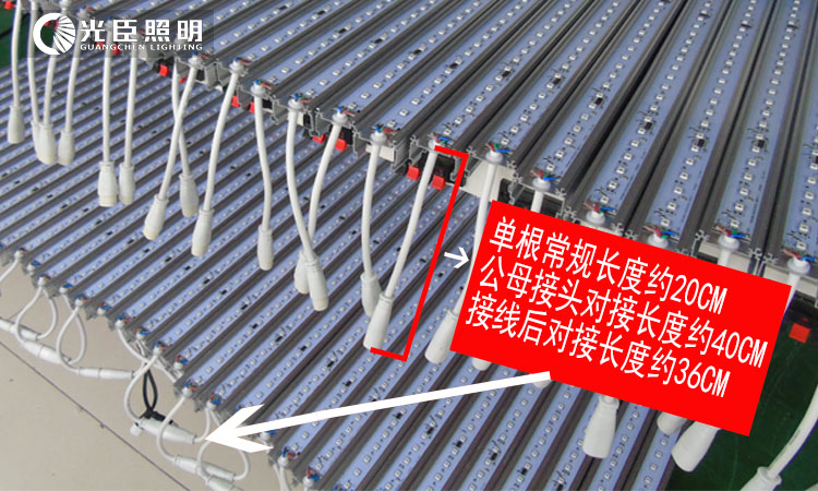 拿光臣智科的LED線條燈為例,我們的防水接頭,一般對接長度在40CM左右,除去燈體內部的接線距離,出線路離大約36CM左右,目前大部分線條燈選用底部出線工藝,出線長度出會相對短一些。