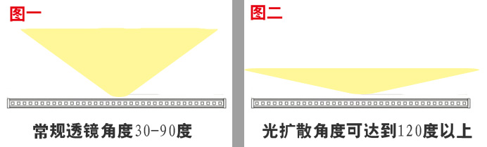 我們用兩張圖讓大家看個明白,LED線條燈為什么要選用光擴(kuò)散透鏡。如上圖,圖一比喻成我們常規(guī)的LED線條燈透鏡的發(fā)光模式,圖二比喻成我們加蓋了光擴(kuò)散透鏡的發(fā)光模式,從兩張圖片的對比當(dāng)中我們能清楚的知道,光擴(kuò)散的作用是把光束往左右兩邊伸展以達(dá)到無暗區(qū)的亮化效果。