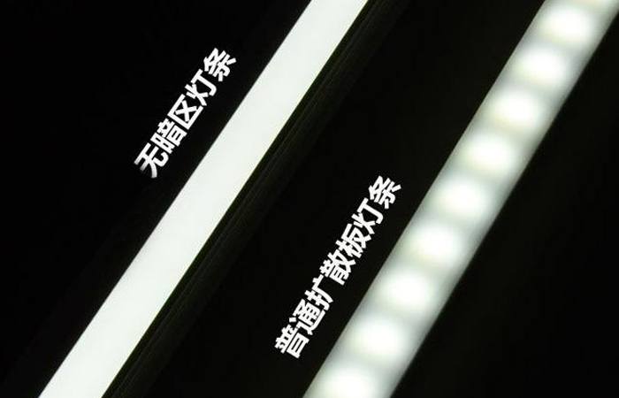 首先,大家來(lái)看一下上面這張圖,圖片中我們能了解到LED線條燈有暗區(qū)和無(wú)暗區(qū)的區(qū)別,出現(xiàn)暗區(qū)的線條燈光束呈現(xiàn)出點(diǎn)狀形態(tài),無(wú)暗區(qū)線條燈的光線十分柔和,原因在于:選用了光擴(kuò)散材料的PC面罩。