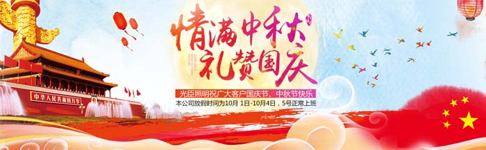 瀏覽:-金秋月圓迎國慶,光臣照明與大家一起迎來2017年10.1國慶節和中秋佳節的到來,在此小編代表全體光臣照明員工們向您致以誠摯的祝福與問候!