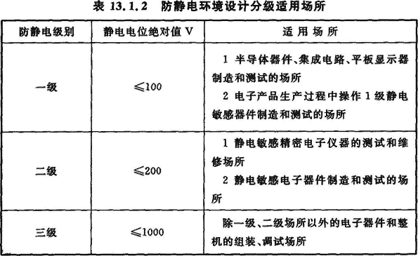 13.1.2 防靜電環境設計應按電子產品或生產工序(設備)進行分級。防靜電環境內靜電電位絕對值應小于電子產品的靜電電位安全值。防靜電環境設計應分為三級,防靜電環境設計分級適用場所應符合表13.1.2的要求。