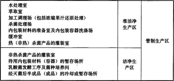 表1 一般食品生產車間管制生產區