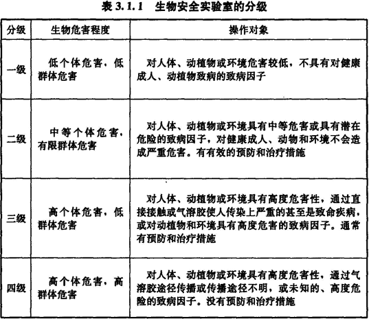 3.1.2 根據實驗室所處理對象的生物危害程度和采取的防護措施,生物安全實驗室分為四級。微生物生物安全實驗室可采用BSL-1、BSL-2、BSL-3、BSL-4表示相應級別的實驗室;動物生物安全實驗室可采用ABSL-1、ABSL-2、ABSL-3、ABSL-4表示相應級別的實驗室。生物安全實驗室應按表3.1.1進行分級。