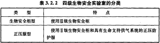 3.2.2 四級生物安全實驗室根據使用生物安全柜的類型和穿著防護服的不同,可分為生物安全柜型和正壓服型兩類,并可符合表3.2.2的規定。