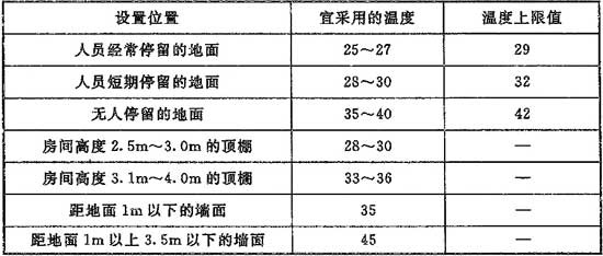 5.7.2 低溫加熱電纜輻射供暖宜采用地板式,低溫電熱膜輻射供暖宜采用頂棚式。輻射體表面平均溫度應符合本規范第5.4.1條的相關規定。